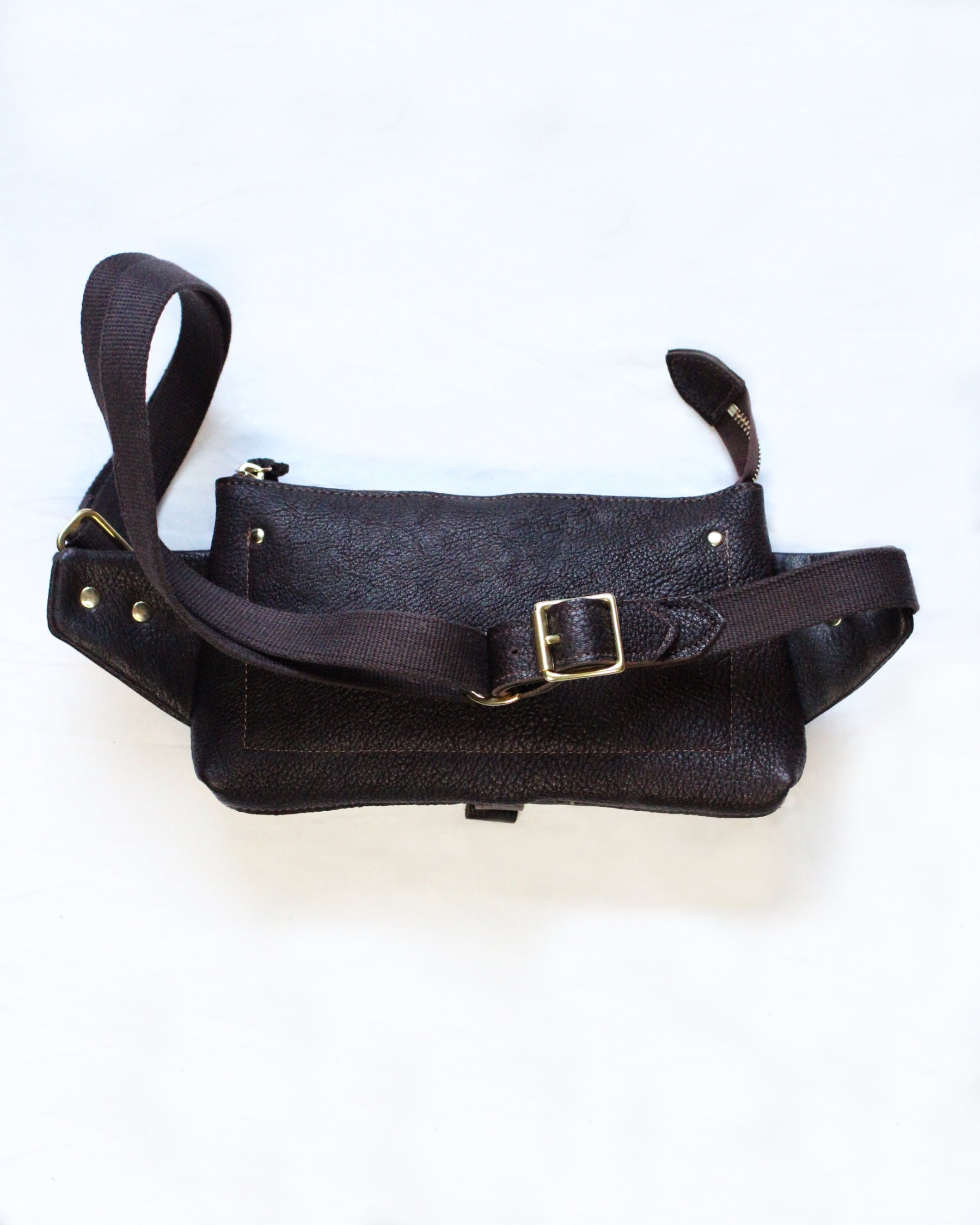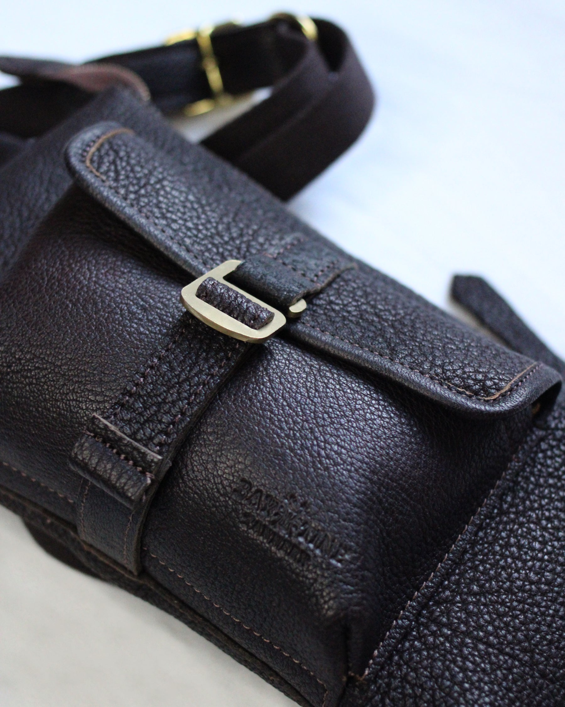 Worn across the body, the Cervus bag has a main pocket with zip closer and internal leather divider, a front pocket with bespoke solid brass G-Hook closer and a solid brass buckle on the strap.
